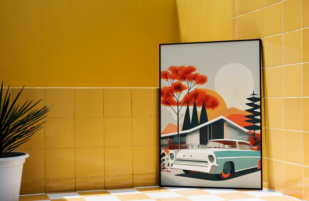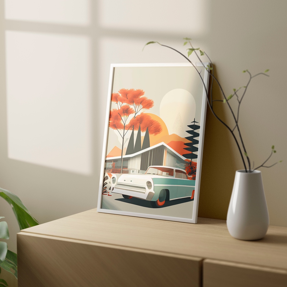 Car parked in front of a house, Printable wall art Mid century